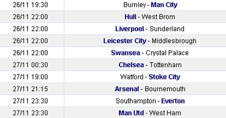 Ở các trận đấu khác, Man Utd sẽ tiếp đón West Ham trong nỗ lực chấm dứt mạch 3 trận hòa liên tiếp trên sân nhà Old Trafford. Đội bóng của Jose Mourinho đã kém đội đầu bảng (Chelsea) đến 9 điểm, kém đội đứng thứ 4 (Arsenal) 6 điểm và họ không được phép xảy chân 1 lần nữa.