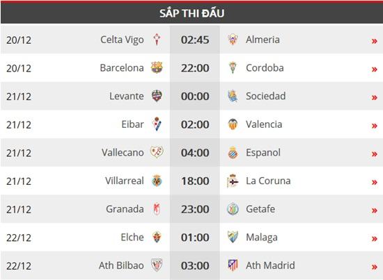 Vòng 16 này, lẽ ra Real Madrid sẽ tiếp đón đối thủ xếp hạng 4 là Sevilla trên sân nhà Bernabeu. Tuy nhiên, vì đội bóng Hoàng gia Tây Ban Nha phải tham dự World Cup CLB nên trận đấu này sẽ được dời lại đến ngày 4/2 năm sau. Real vắng mặt, Barca dễ thở, trận cầu đáng chú ý nhất sẽ dồn sang đội xếp thứ 3 Atletico Madrid.