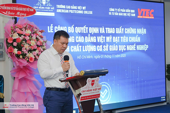 Ngày 1/11/2025, Trường Cao đẳng Việt Mỹ (American Polytechnic College – APC) đã long trọng tổ chức Lễ công bố quyết định và trao Giấy chứng nhận đạt tiêu chuẩn Kiểm định chất lượng cơ sở giáo dục nghề nghiệp, do Công ty Cổ phần Kiểm định và Tư vấn Giáo dục Việt Nam (VTEC) thực hiện.