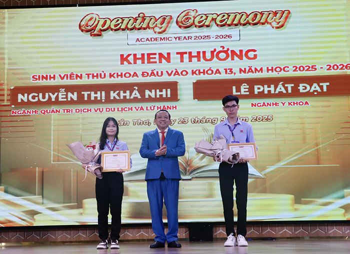 Tại lễ khai giảng, nhà trường vinh danh và tặng học bổng cho 2 thủ khoa đầu vào năm học 2025-2026, mỗi suất trị giá 15 triệu đồng. Và dành nhiều suất học bổng với tổng trị giá hơn 300 triệu đồng trao tặng những sinh viên có thành tích học tập xuất sắc và những sinh viên vượt khó học tốt… Nhà trường còn dành tặng học bổng ưu đãi hơn 6 tỷ đồng cho những thí sinh trúng tuyển có điểm đầu vào cao, góp phần giúp sinh viên giảm áp lực tài chính trong giai đoạn đầu đại học.