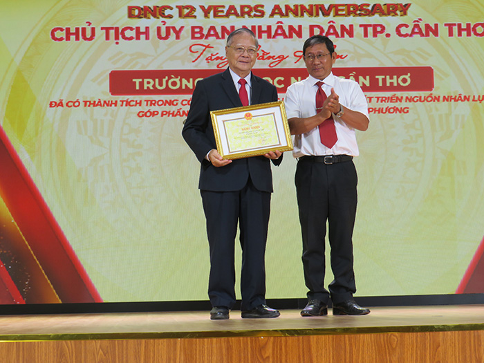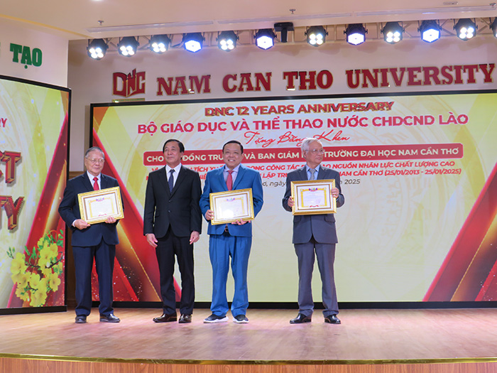 Dịp này, Bộ Giáo dục và Thể thao, nước CHDCND Lào tặng Bằng khen cho TS.LS Nguyễn Tiến Dũng – Chủ tịch Hội đồng trường Trường Đại học NCT, và tập thể trường vì có thành tích xuất sắc trong công tác đào tạo nguồn nhân lực chất lượng cao. Chủ tịch UBND TP.Cần Thơ tặng Bằng khen cho tập thể DNC có thành tích trong công tác GD-ĐT, phát triển nguồn nhân lực góp phần phát triển kinh tế – xã hội tại địa phương.