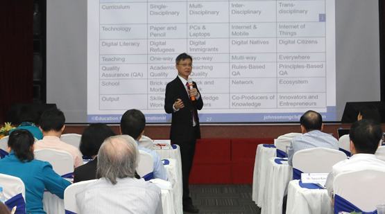 Ông Jonhson Ong Chee Bin (Chuyên gia kiểm định quốc tế AUN) vừa tham dự hội thảo giới thiệu mô hình giáo dục thông minh 4.0 do Trường ĐH Nguyễn Tất Thành tổ chức ngày 8-3 để chia sẻ, trao đổi về công tác kiểm định chất lượng AUN và chất lượng giáo dục quốc tế với các chuyên gia đầu ngành trong lĩnh vực. Tại đây, ông Jonhson Ong Chee Bin đã giới thiệu khái quát về nền công nghiệp trải qua các thời kỳ phát triển, từ cuộc cách mạng công nghiệp lần thứ nhất dần dần tiến tới cuộc cách mạng công nghiệp lần thứ 4 đang diễn ra mạnh mẽ ở một số nước trên thế giới; đồng thời nhận định nền công nghiệp 4.0 có sức ảnh hưởng trực tiếp đến từng cá thể, gia đình, doanh nghiệp và đặc biệt chịu ảnh hưởng lớn nhất chính là môi trường giáo dục – nơi trực tiếp đào tạo nguồn nhân lực phục vụ cho công nghiệp 4.0. Hướng đến mô hình giáo dục 4.0 phù hợp xu thế mới, PGS.TS Nguyễn Mạnh Hùng (Hiệu trưởng Trường ĐH Nguyễn Tất Thành) đã giao cho các đơn vị tìm hiểu, đề xuất giải pháp phù hợp để phát triển chương trình giảng dạy, những kỹ năng mới và chuẩn đầu ra đảm bảo cho thế hệ mới khả năng làm chủ thông tin, làm chủ công nghệ, thúc đẩy được tinh thần sáng tạo khởi nghiệp.
