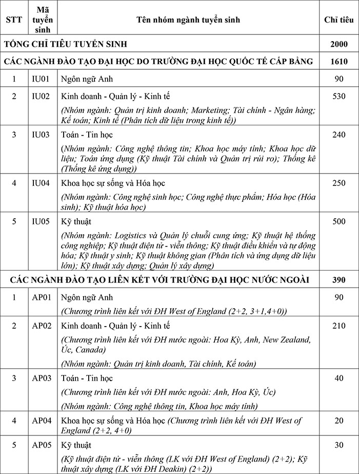 Năm 2025, Trường ĐH Quốc tế (ĐH Quốc gia TP.HCM) xét tuyển 2.000 chỉ tiêu bằng 3 phương thức cho 5 nhóm ngành bậc ĐH đối với chương trình do trường cấp bằng và cả chương trình liên kết đào tạo.