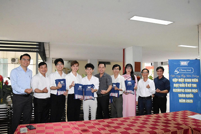 GS.TS Huỳnh Văn Sơn – Hiệu trưởng Trường Đại học Sư phạm Thành phố Hồ Chí Minh tặng quà động viên các sinh viên đạt giải tại kỳ thi Olympic Sinh học toàn quốc năm 2025