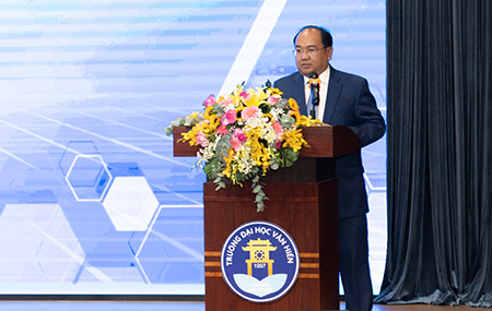 PGS.TS Nguyễn Minh Đức (tân Hiệu trưởng Trường ĐH Văn Hiến) phát biểu trong lễ bổ nhiệm ban điều hành và cán bộ quản lý trường nhiệm kỳ 2022 – 2024