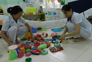 Giáo viên Trường Mẫu giáo Sơn Ca 3, Q.11 làm vệ sinh. Ảnh: K.Anh
