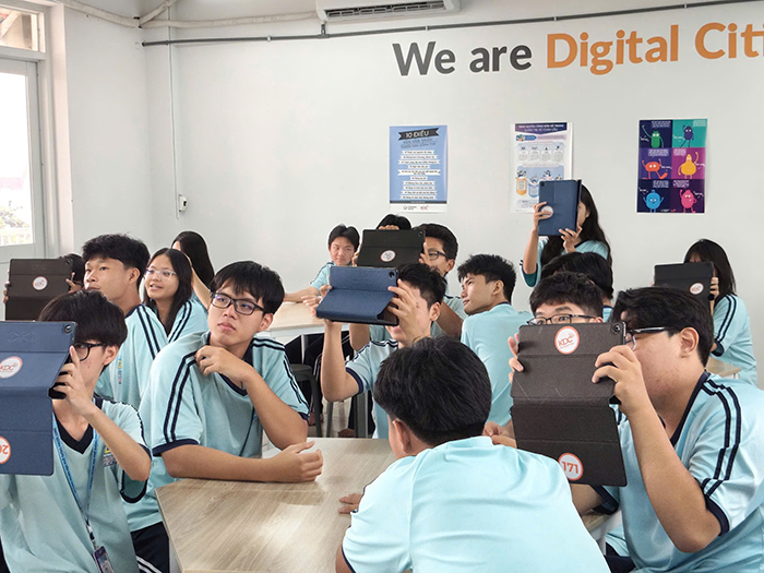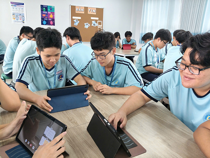 Là một trong số 100 trường học trên địa bàn TP.HCM được UBND TP công nhận là trường học số trong 2025, Trường THPT Phước Long đã sớm hoàn thiện hệ sinh thái giáo dục số. Hiện nay toàn trường đã phủ ti vi, wifi khắp các lớp học; trường có phòng STEM, phòng công dân số, phòng studio, 4 phòng máy, hỗ trợ tối đa công tác đổi mới giáo dục gắn với chuyển đổi số trong dạy học và quản trị nhà trường. Tới đây, nhà trường tiếp tục nâng cấp đường truyền để phục vụ hiệu quả hơn việc chuyển đổi số. Cô Vũ Thị Hồng Châu (Hiệu trưởng nhà trường) cho biết, nhà trường rất chú trọng tập huấn, nâng cao năng lực cho đội ngũ về chuyển đổi số, gắn với đổi mới phương pháp giảng dạy, kiểm tra đánh giá. Để làm sao thầy cô hiểu về vai trò của chuyển đổi số, “vững tay, chắc tay” khi ứng dụng công nghệ số, AI vào giảng dạy, làm mới bài học, thu hút học sinh, nâng cao hiệu quả giáo dục. “Nhà trường luôn khuyến khích, tạo mọi điều kiện để thầy cô đổi mới, ứng dụng công nghệ số vào giảng dạy. Tuy nhiên, nhà trường không đặt nặng về thi đua, không áp lực thành tích cho giáo viên mà điều quan trọng là tạo ra môi trường về cả nền tảng, trang thiết bị cũng như hỗ trợ nâng cao chuyên môn, để thầy cô thấy việc đổi mới nhẹ nhàng, mang lại giá trị thiết thực cho chính thầy cô và học sinh, từ đó đổi mới mang tính tự thân”, cô Hồng Châu chia sẻ.