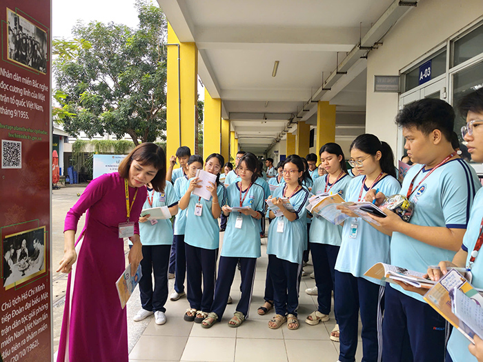 Không gian văn hóa Hồ Chí Minh của trường được bố trí dọc hành lang khu vực sảnh lầu 1 và lầu 2. Thông tin về cuộc đời và sự nghiệp cách mạng của Chủ tịch Hồ Chí Minh được thiết kế trang trọng, có mã quét QR để học sinh dễ dàng truy cập. Cô Bùi Thị Thủy (giáo viên môn lịch sử) hướng dẫn học sinh lớp 12A4 đi học hành lang, qua từng cột mốc thì dừng lại, điểm lại những dấu ấn lịch sử ghi dấu Chủ tịch Hồ Chí Minh trong hai cuộc kháng chiến chống Pháp và chống Mỹ trường kỳ của dân tộc. Các em học sinh chăm chú nghe và ghi chép. Sau khi học tại Không gian văn hóa Hồ Chí Minh, học sinh trở về lớp, từng tổ tiếp tục hệ thống lại kiến thức vừa học tại không gian văn hóa thông qua sơ đồ tư duy hoặc áp phích. Sản phẩm của từng tổ được giáo viên chấm điểm và dùng kết quả làm điểm kiểm tra thường xuyên cho môn lịch sử. “Học lịch sử gắn với Không gian văn hóa Hồ Chí Minh giúp tiết học thú vị hơn, chúng em dễ dàng tiếp cận kiến thức lịch sử một cách nhẹ nhàng chứ không khô khan. Đặc biệt, khi học về Chủ tịch Hồ Chí Minh, qua Không gian văn hóa Hồ Chí Minh, chúng em hiểu thêm sâu sắc về cuộc đời và sự nghiệp cách mạng của Bác đối với sự nghiệp đấu tranh giải phóng dân tộc, thống nhất đất nước, thêm yêu và tự hào về lịch sử nước nhà”, Hà Trang (học lớp 12A4) cho hay.