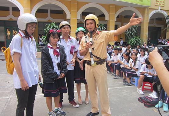 | Nhà trường tuyệt đối không giữ xe trên 50cc đối với trường hợp học sinh chưa đủ tuổi lái xe theo quy định. Trong ảnh: Trang bị kiến thức an toàn giao thông cho học sinh |