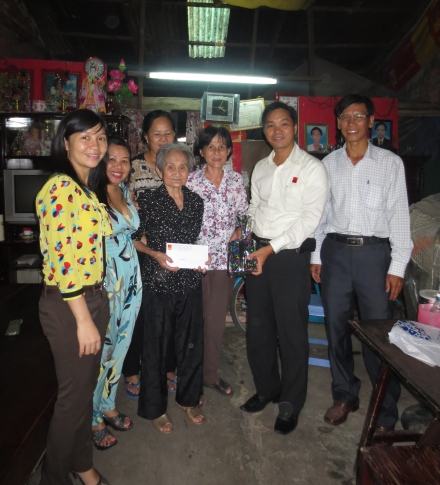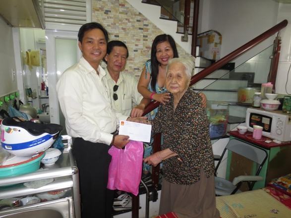 Cụ thể, đại diện trường đã đến thăm các cụ: Huỳnh Thị Điền năm nay 71 tuổi nhà số 532/21/12/3 KP2, P. Bình Trị Đông B, quê Quảng Ngãi sống cô độc, nhờ hàng xóm cưu mang hằng ngày; Cụ Nguyễn Thị Lựu, 79 tuổi, ngụ tại 35/22 đường Tỉnh lộ 10, P. An Lạc A và cụ Nguyễn Thị Sáu, 106 tuổi , sống tại số 212/38 Nguyễn Thiện Thuật P3, Quận 3. Cụ Sáu là cụ bà lớn tuổi nhất mà BS Ngô Minh Đức – giáo viên của trường đang theo dõi bệnh án trong thời gian qua. Cụ đã được UBND TP tặng giấy khen cách đây 3 năm, hiện nay cụ vẫn khỏe, minh mẫn và ăn uống bình thường.