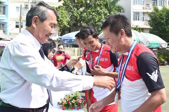 | Ông Nguyễn Hữu Hùng, Chủ tịch Công đoàn ngành giáo dục TP, trao huy chương cho đội vô địch |