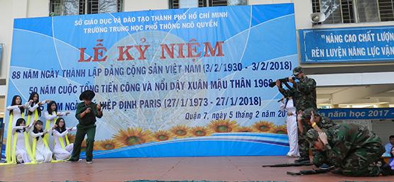 Tại buổi lễ, nhà trường còn tổ chức thi đố vui về lịch sử Đảng, về chiến dịch Mậu Thân 1968. Qua đó giúp học sinh ôn lại những kiến thức lịch sử đã học. Dịp này, Đảng bộ Trường THPT Ngô Quyền cũng đã khen thưởng đảng viên có nhiều thành tích trong việc học tập và làm theo tấm gương đạo đức Hồ Chí Minh, hoàn thành xuất sắc nhiệm vụ… Trước đó, tối 1-2, Đoàn Trường THPT Ngô Quyền cũng đã tổ chức cho gần 200 đoàn viên ưu tú dâng hương, dâng hoa tại Nghĩa trang Liệt sĩ huyện Nhà Bè.