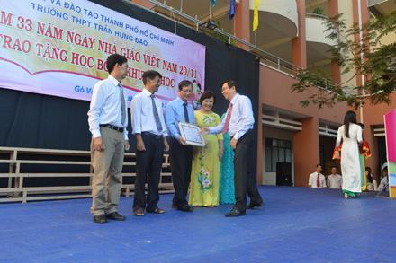 Ông Đỗ Minh Hoàng – chánh văn phòng Sở GD-ĐT TP.HCM trao bằng khen cho Hiệu trưởng Trường THPT Trần Hưng Đạo