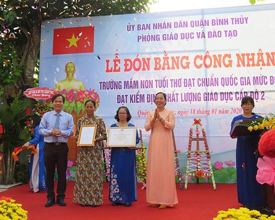 TS.Nguyễn Phúc Tăng – Phó Giám đốc Sở GD-ĐT và bà Phan Thị Nguyệt – Phó Chủ tịch UBND quận Bình Thủy trao Bằng công nhận trường đạt chuẩn quốc gia cho nhà trường