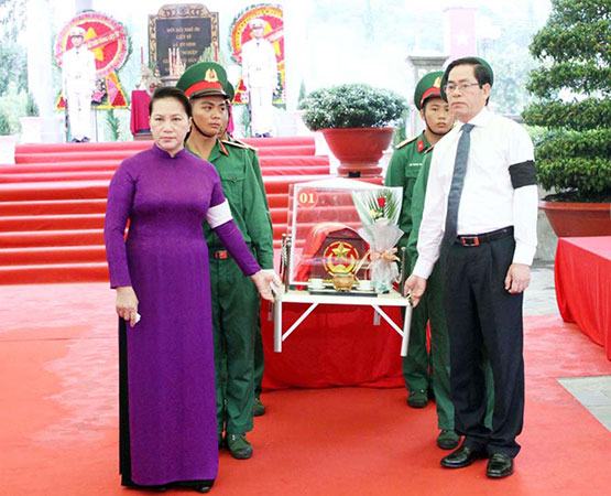 Chủ tịch Quốc hội Nguyễn Thị Kim Ngân đưa hài cốt liệt sĩ quân tình nguyện Việt Nam hy sinh ở Campuchia ra huyệt mộ. Ảnh: VOV