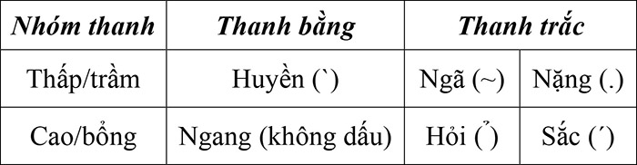 Thanh điệu tiếng Việt gồm 6 thanh được ghi bởi 5 dấu, gồm: thanh ngang (không dấu), thanh/dấu huyền (`), thanh/dấu sắc (´), thanh/dấu hỏi ( ̉), thanh/dấu ngã (~) và thanh/dấu nặng (.); có thể chia thành hai nhóm: nhóm thanh cao/thanh bổng (gồm 3 thanh: ngang/không – hỏi – sắc) và nhóm thanh thấp/thanh trầm (gồm 3 thanh: huyền – ngã – nặng). Hầu hết từ láy tiếng Việt bị chi phối bởi quy tắc hài thanh (hài hòa âm thanh) theo bảng sau: