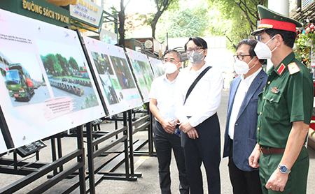Thiếu tướng Lê Ngọc Hải (Phó tư lệnh, Bộ tư lệnh TP.HCM) cùng ban tổ chức nhìn lại hình ảnh Quân đội Nhân dân Việt Nam tham gia chống dịch tại triển lãm