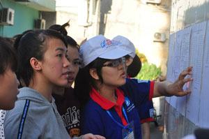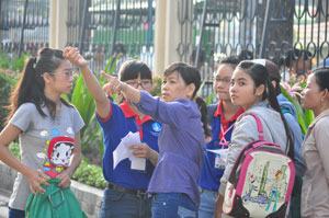 Sinh viên tình nguyện hướng dẫn thí sinh tìm hiểu thông tin phòng thi sáng 3-7 tại Hội đồng thi ĐH Sư phạm TP.HCM. Ảnh: Lộc Sâm