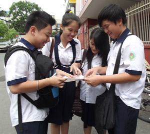 Thí sinh thảo luận bài thi tại kỳ tuyển sinh vào lớp 10 năm học 2013-2014 ở Hội đồng thi THCS Colette (Q.3, TP.HCM). Ảnh: D.Bình |