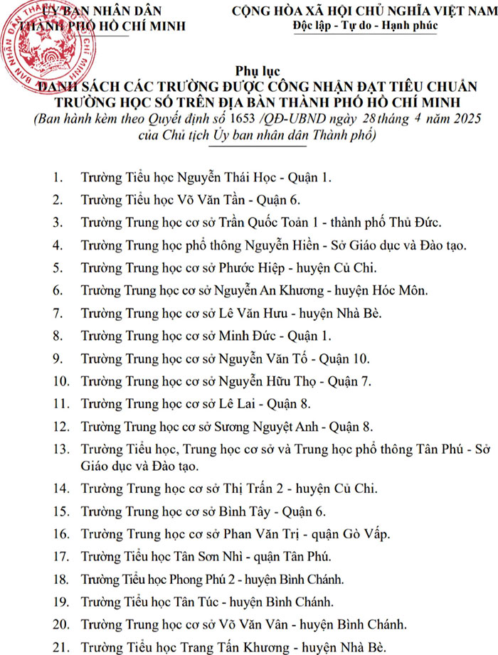 Ngày 28-4, Phó Chủ tịch UBND TP.HCM Trần Thị Diệu Thúy đã có quyết định công nhận 100 trường học trên địa bàn TP.HCM đạt tiêu chuẩn trường học số. Trường học số là một trong 2 công trình lớn của ngành giáo dục TP.HCM chào mừng kỷ niệm 50 năm Ngày Giải phóng miền Nam, thống nhất đất nước (30-4-1975/ 30-4-2025).