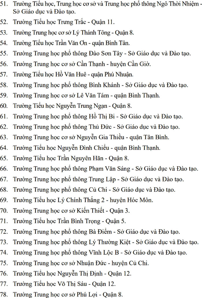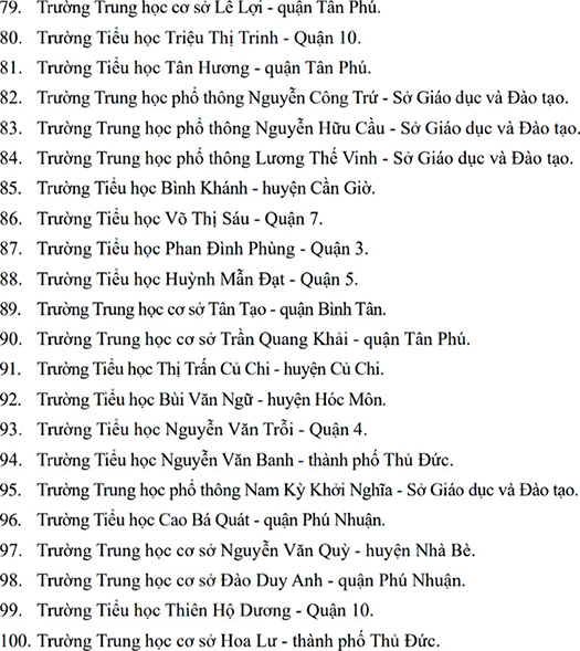 Theo đó, danh sách 100 trường học số tại TP.HCM bao gồm 36 trường tiểu học, 37 trường THCS và 25 trường THPT và 2 trường TH-THCS-THPT.