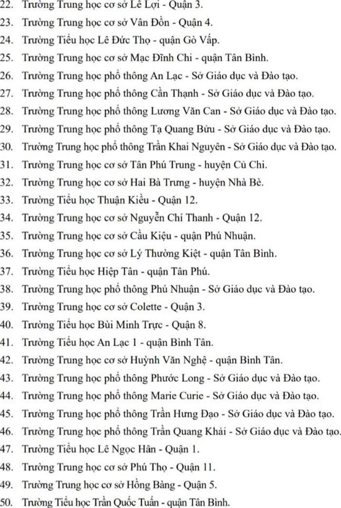 Theo đó, danh sách 100 trường học số tại TP.HCM bao gồm 36 trường tiểu học, 37 trường THCS và 25 trường THPT và 2 trường TH-THCS-THPT.