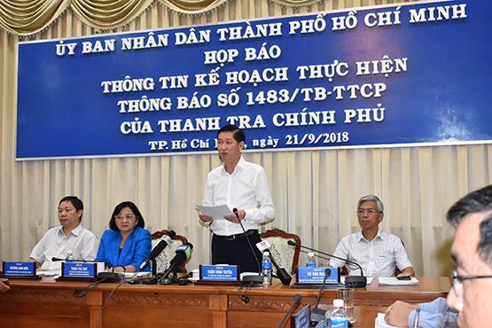 Ngày 21-9, UBND TP.HCM tổ chức họp báo thông tin Kế hoạch thực hiện thông báo số 1483/TB-TTCP ngày 4-9-2018 của Thanh tra Chính phủ về các sai phạm Khu đô thị mới Thủ Thiêm (KĐTMTT). Đồng chí Trần Vĩnh Tuyến – Phó chủ tịch UBND TP.HCM chủ trì buổi họp báo.