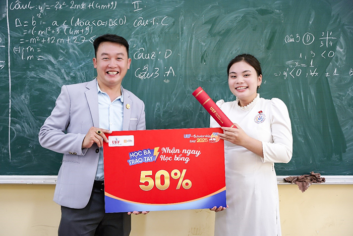 Từ TP.HCM, đoàn công tác của UEF đã đến trực tiếp các trường THPT để trao tặng học bổng cho những học sinh có kết quả học bạ tốt, tinh thần cầu tiến và định hướng rõ ràng cho tương lai. Tại mỗi điểm trường, hàng chục suất học bổng có giá trị từ 25% đến 100% học phí đã được trao tận tay học sinh lớp 12. Không chỉ là giá trị về tài chính, những suất học bổng còn mang theo kỳ vọng, khích lệ tinh thần và niềm tin mà UEF đặt vào thế hệ trẻ tài năng, nỗ lực.