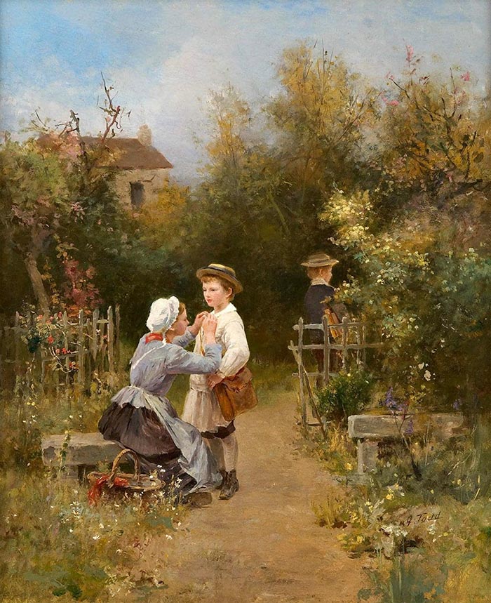 Tôi cũng tình cờ xem được một bức tranh khác, có tên là “Mặc đồ trước khi đi học” của họa sĩ người Anh Henry George Todd (1847-1898). Bức tranh vẽ khung cảnh trước sân nhà, một người mẹ trẻ đang cẩn thận cài lại áo cho đứa con trai đang chuẩn bị đi học, sát đó ở đường làng có một cậu bé khác đang chờ bạn đi học… Hình ảnh người mẹ chăm chút quần áo cho con trước giờ đến trường hẳn cũng gợi cho chúng ta nhiều ký ức êm đềm, đẹp đẽ về người mẹ, người cha đã từng săn sóc việc học của chúng ta thuở bé, hay chính chúng ta đã và đang chăm lo cho việc học của con em mình. Nên nét vẽ của người họa sĩ thể hiện khuôn mặt vui tươi, tự nhiên ở đứa trẻ như có cảm nhận một cách thường xuyên, tức là lặp lại hằng ngày.