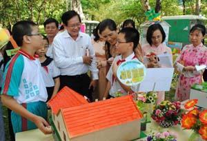 “Hiện nay, các phương tiện thông tin đại chúng không ngừng thông báo về tình trạng nóng dần lên của trái đất, ngày càng nghiêm trọng. Khí thải từ các nhà máy, phương tiện giao thông và nhiều nguồn khác từ cuộc sống con người đã “nung nóng” trái đất và làm ảnh hưởng nghiêm trọng đến chính sự sinh tồn của loài người. Trước những thảm họa và thách thức của biến đổi khí hậu đối với nhân loại, Việt Nam cũng đang phải đối mặt với vấn đề này và thực hiện nhiều biện pháp để hạn chế hậu quả của nó. Vì vậy, chúng em đã mạnh dạn lên ý tưởng “Năng lượng sạch” và thiết kế mô hình Nhà sử dụng nguồn năng lượng sạch: Năng lượng mặt trời và năng lượng gió để tạo ra nguồn năng lượng điện sạch sử dụng trong đời sống hằng ngày với mục đích vừa tiết kiệm điện năng vừa góp phần chung tay bảo vệ môi trường” – em Ngọc Duy (học sinh lớp 5/2 Trường Tiểu học Lương Thế Vinh) giải thích. Còn em Hà Ngọc Xuân Mai (học sinh Trường Tiểu học Lê Ngọc Hân) cho biết: “Với mong muốn góp phần làm cho cuộc sống được tốt đẹp hơn, chúng em giới thiệu mô hình khoa học sử dụng turbine gió trục thẳng (còn được gọi là Savonius) với tên gọi “Nông trại thân thiện”. Chúng em muốn gửi gắm một thông điệp: “Bảo vệ môi trường, vì một hành tinh xanh mãi mãi”. Mô hình “Nông trại thân thiện” được hoạt động hoàn toàn dựa vào sức gió để phục vụ những sinh hoạt và sản xuất của nông trại, tránh gây ô nhiễm môi trường”.