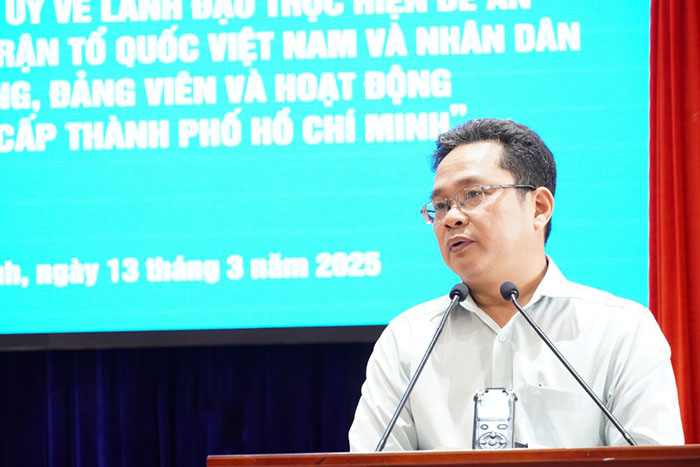 Sáng 13-3, Ban Thường trực Ủy ban MTTQ Việt Nam TP.HCM tổ chức hội nghị sơ kết triển khai thực hiện Chỉ thị 13-CT/TU của Ban Thường vụ Thành ủy TPHCM về lãnh đạo thực hiện đề án “Nâng cao vai trò của Mặt trận Tổ quốc Việt Nam và nhân dân giám sát tổ chức Đảng, đảng viên và hoạt động của chính quyền các cấp TP.HCM, giai đoạn 2021 – 2030”, trong hệ thống MTTQ Việt Nam TP.HCM. Đến dự có Phó Chủ tịch Ủy ban MTTQ Việt Nam TP.HCM Phạm Minh Tuấn.
