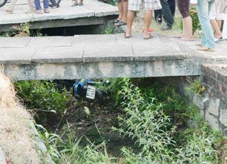 Cú va chạm làm người phụ nữ bị thương ở tay nhưng xe máy của Nguyên lao xuống con mương bê tông sâu 1,3 m, lòng mương rộng hơn 2 m.