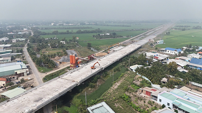Cầu trên tuyến Vành đai 3 TP.HCM bắc qua sông Bến Lức đang được hoàn thiện các hạng mục chính