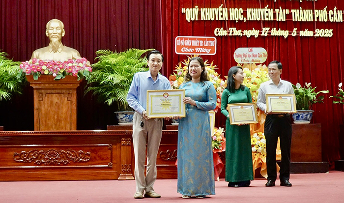 Phó Chủ tịch UBND TP.Cần Thơ Nguyễn Thị Ngọc Điệp trao Bằng khen của Trung ương Hội Khuyến học Việt Nam cho ông Nguyễn Phương Quang – Giám đốc VATC Cần Thơ (áo xanh, bìa trái), vì những thành tích xuất sắc của Trung tâm Anh ngữ Việt Mỹ (VATC) trong phong trào thi đua khuyến học, khuyến tài, xây dựng xã hội học tập năm 2024