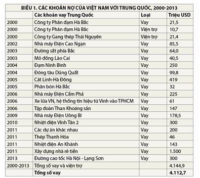 Theo một nghiên cứu chi tiết về các khoản nợ của các nước trong đó có Việt Nam với Trung Quốc, thì tổng số nợ của Việt Nam với Trung Quốc (bao gồm cả Chính phủ, doanh nghiệp nhà nước, doanh nghiệp tư) có thể đã lên tới 4 tỉ đô la Mỹ, chỉ có thể tính đến hết năm 2013 (xem biểu 1 đính kèm). Số liệu trên cũng chưa thể tính trừ đi khoản nợ gốc đã trả.