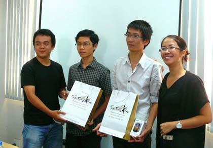 Hai tác giả trẻ Nguyễn Văn Thế và Phan Thanh Thanh đến thăm quan và nhận quà khuyến khích từ VNG