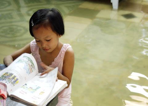 | Bé gái này phải ngồi học dưới điều kiện nước ngập. Ảnh: An Nhơn. |
