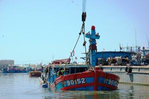 (GD TP.HCM – Đà Nẵng): – Sau nhiều ngày tiến hành lai dắt, đến chiều 2-6, tàu cá mang số hiệu ĐNa 90152 của bà Huỳnh Thị Như Hoa, trú tại phường Xuân Hà (Thanh Khê, Đà Nẵng) đã được HTX trục vớt và đóng tàu Bắc Mỹ An (Sơn Trà, Đà Nẵng) trục vớt lên bờ. Tại đây, đại diện ngành chức năng cũng đã có mặt kịp thời để tiến hành kiểm định, ghi nhận mức độ thiệt hại của con tàu này. Khi được trục vớt lên, tàu lộ rõ một lỗ lớn ngay bên mạn trái do bị đâm quá mạnh; ngoài ra, các hệ thống điện đàm, máy móc, ngư lưới cụ, ca-bin trang bị trên tàu đều bị hư hại nặng.