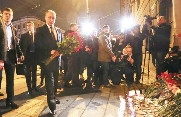 Tổng thống Nga Vladimir Putin đặt hoa tưởng niệm nạn nhân bên ngoài ga xe điện ngầm Tekhnologicheskiy Institut ở St. Petersburg. Ảnh: REUTERS
