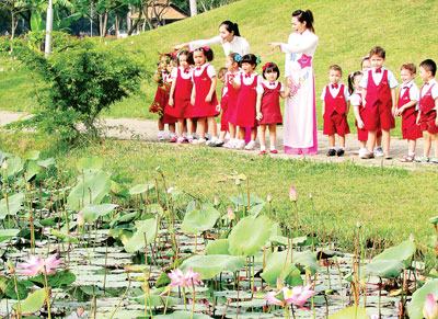 Một buổi sinh hoạt ngoài trời của các cháu mẫu giáo tư thục ở quận 7, TPHCM. Ảnh: THÁI BẰNG