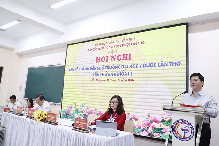 Phát biểu tại hội nghị, ông Nguyễn Tuấn Anh – Phó Bí thư Thành ủy Cần Thơ ghi nhận và đánh giá cao tinh thần đoàn kết, trách nhiệm, chủ động, sáng tạo của Đảng ủy Trường ĐHYD Cần Thơ trong lãnh đạo, chỉ đạo, điều hành đạt nhiều kết quả quan trọng. Đồng thời đề nghị trường tiếp tục tăng cường công tác xây dựng Đảng bộ trong sạch, vững mạnh; nâng cao năng lực lãnh đạo và sức chiến đấu của các tổ chức Đảng; phân công nhiệm vụ theo phương châm: “Rõ người, rõ việc, rõ trách nhiệm, rõ thời hạn, rõ lộ trình, rõ kết quả cụ thể”. Tập trung quán triệt, triển khai, cụ thể hóa thực hiện tốt 3 nghị quyết quan trọng, gồm: Nghị quyết số 72 của Bộ Chính trị; Nghị quyết Đại hội đại biểu Đảng bộ TP.Cần Thơ nhiệm kỳ 2025-2030, đặc biệt là mục tiêu chung: “Xây dựng TP.Cần Thơ là trung tâm của vùng về y tế chuyên sâu”; Nghị quyết Đại hội Đảng bộ Trường ĐHYD Cần Thơ nhiệm kỳ 2025-2030, trong đó có mục tiêu xây dựng Trường ĐHYD Cần Thơ trở thành trường ĐH trọng điểm quốc gia trong lĩnh vực khoa học sức khỏe… Phát huy vai trò của các đoàn thể chính trị – xã hội trong xây dựng môi trường giáo dục lành mạnh, nhân văn; đồng thời lãnh đạo tổ chức thực hiện hiệu quả 7 nội dung, các chỉ tiêu năm 2026 đã đăng ký với Thành ủy Cần Thơ, xem đây là nhiệm vụ chính trị trọng tâm, xuyên suốt trong năm 2026.