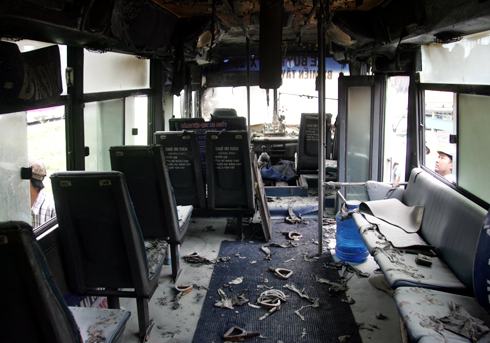 ![]() Toàn bộ ghế và trần xe buýt bị cháy. Ảnh: An Nhơn.