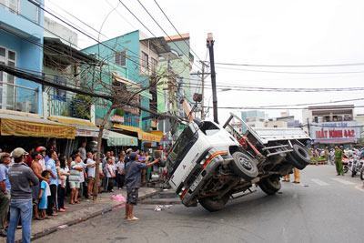 Khoảng 10 giờ 45 ngày 21-3, chiếc xe cẩu 57L-5387 lưu thông trên đường Tùng Thiện Vương, hướng ra cầu Chà Và (phường 12, quận 8, TPHCM) tay cẩu vướng dây cáp viễn thông, rồi lật nhào (ảnh). Một người phụ nữ đi xe đạp không may đã bị xe cẩu va trúng bị thương nặng.