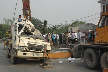 Tại hiện trường, chiếc xe ôtô chở bêtông đầu bẹp rúm, bêtông tươi đổ tung tóe trên mặt đường. Bên cạnh đó là mảnh vỡ của xe máy cùng máu chảy lênh láng trên mặt đường pha trộn bêtông.