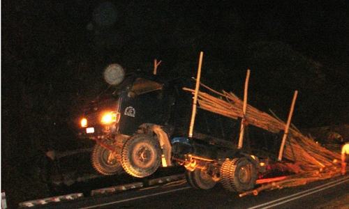 Trong lúc chở gỗ tràm vượt đèo nhập cho nhà máy chế biến dăm gỗ giấy thuộc Khu Kinh tế Chân Mây – Lăng Cô, xe tải của Doanh nghiệp Tư nhân Sơn Hùng (thị trấn Phú Lộc) mất cân bằng trọng lực, buồng lái và hai bánh trước bị bẩy nổi ngược lên khỏi mặt đường nhựa.