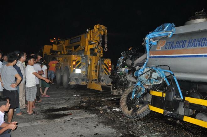 Do hai xe đều chạy với tốc độ cao nên sau cú va chạm mạnh đầu của cả hai xe bị bẹp dúm, kính vỡ vụn, xăng dầu trên xe bồn chảy tràn lan giữa đường.