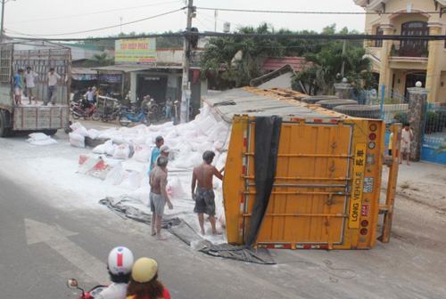 Chiếc xe đầu kéo chở 50 tấn bột mì bất ngờ mất lái tông nát 50 mét dải phân cách rồi lật ngang khiến hàng chục bao bột đổ xuống đường.
