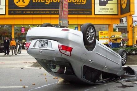 Chiếc xe lật hẳn 4 bánh lên trời, 2 người trong xe nguy kịch