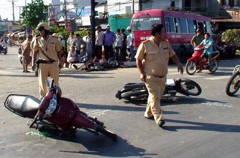 Tại hiện trường, 3 xe máy hư hỏng nằm sau đuôi xe khách. Ôtô gây nạn hỏng phần đầu nằm trên dải phân cách. Giao lộ bị ùn tắc hơn một tiếng cho tới khi xe khách được cẩu đi.