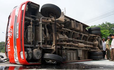 Ôtô khách 24 chỗ của hãng Thành Công chở 14 người do tài xế Nguyễn Văn Hòa (40 tuổi, ngụ TP HCM) lái. Khi đến ngã tư Hòa Lợi, do va chạm với xe container loại 40 feet, xe khách trượt dài 40 m và lật nghiêng giữa đường.